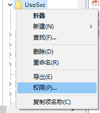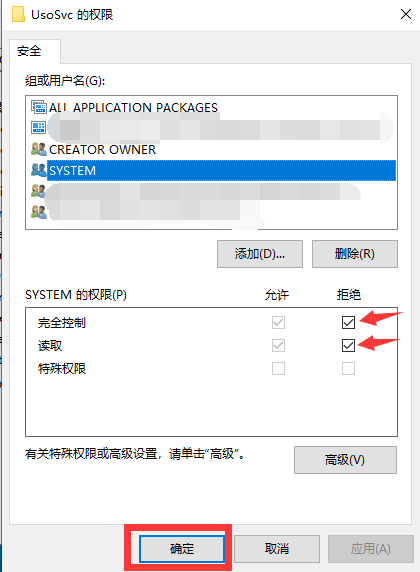 右键单击"UsoSvc"选择权限...,然后选择"SYSTEM"用户组,将其所有权限勾选拒绝,最后点击确定。
