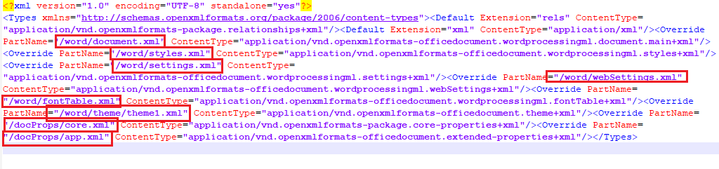 首先我们打开[Content_Types].xml文件,内部的xml结构如下图: