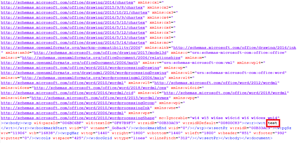 我们可以猜测,这个文件规定了docx的一些信息。进一步观察,可以清楚地看出,里面又关联了一些xml文件,如document.xml,core.xml等。可以说是将这些文件串联起来,定义了每一个xml文件的类型和作用。