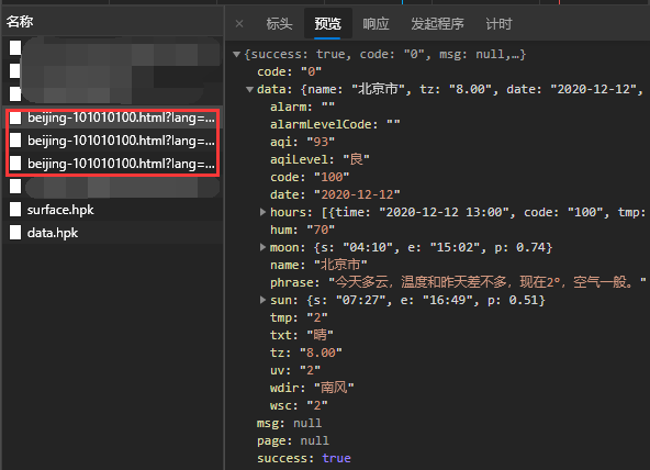 查看第一个请求返回的json数据,可以猜出来是当前的天气数据。