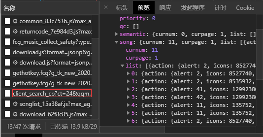 可以看出来,这里w参数是搜索内容,在data->song->list下有每首歌的具体信息